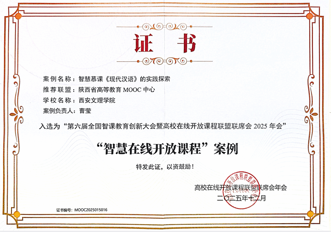 12月13日,第六届全国智课教育创新大会暨高校在线开放课程联盟联席会2025年会在武汉隆重召开,来自全国高校的500余名专家学者围绕"智慧课程引领AI课程建设新范式"进行深入研讨。在这一智慧教育领域的年度盛会上,师范学院曹莹教授主持的《现代汉语》课程入选第六届全国“智慧在线开放课程”优秀案例,该课程为国家一流线上课程,在中国大学慕课网和智慧课树双平台运行,选课高校102所,选课学生累计30146人。本次优秀案例全国共评选出120个,陕西省获评优秀案例20个。