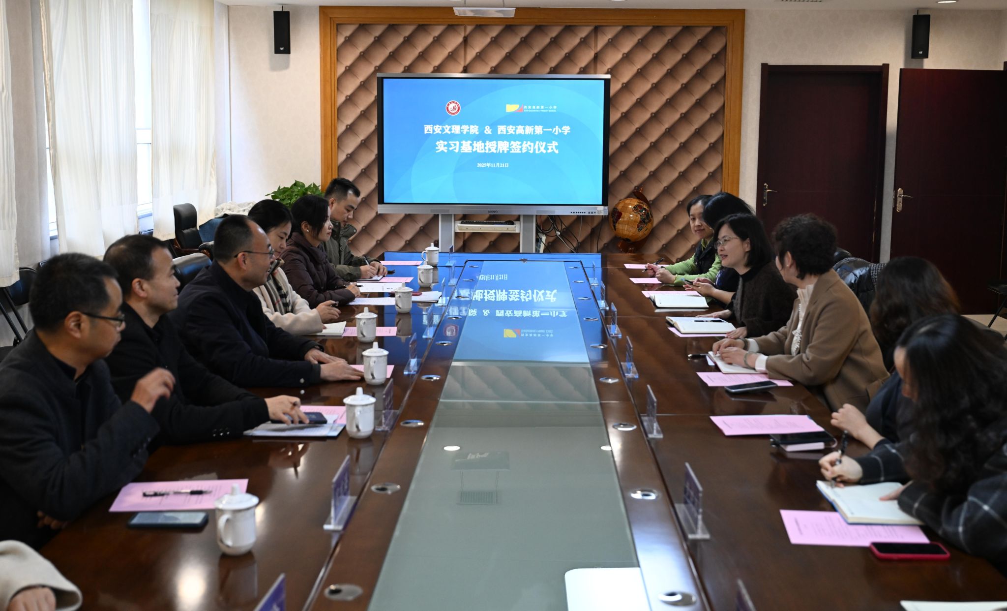 11月21日,校务委员徐东升、招就处处长李小勇、师范学院院长曹莹、副院长国晓华、小学教育系骨干教师闫成海、魏平西、杨也、陈渝一行,赴西安高新区第一小学开展访企拓岗活动,并举行实习基地签约挂牌仪式。