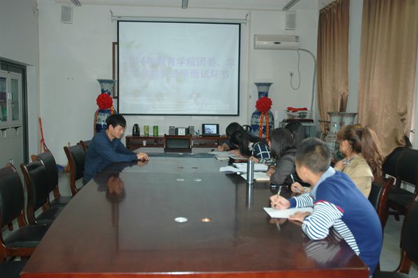 2014年10月14日下午四点半,西安文理学院教育学院团委、学生会在明德楼B0312召开学生会干部换届选举面试环节。学工办主任邵力老师参加了本次干部换届选举面试环节。